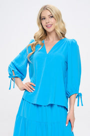Solid V neck 3/4 Sleeve Top with Sleeve Tie