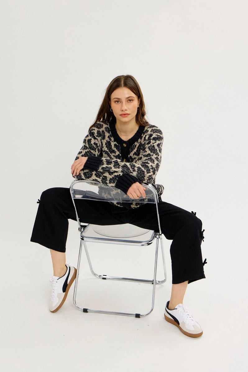 Elevate your layering game with this striking animal print cardigan, where bold leopard jacquard meets refined tailoring. Crafted from a luxurious blend of nylon, acrylic, and polyester, this oversized sweater cardigan drapes beautifully over everything from structured blazers to fluid slip dresses. The button-front closure, contrast ribbing, and practical side pockets deliver understated sophistication, while the wild print commands attention. Designed for the modern urbanite who transitions seamlessly from boardroom to evening plans, this piece balances edge with elegance. Long sleeves, rounded neckline, and a relaxed fit make it endlessly versatile—a wardrobe essential that works as hard as you do.