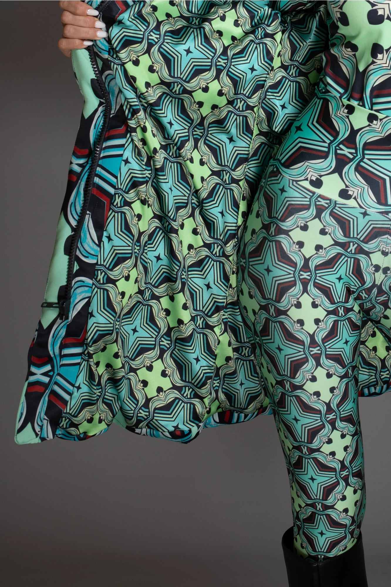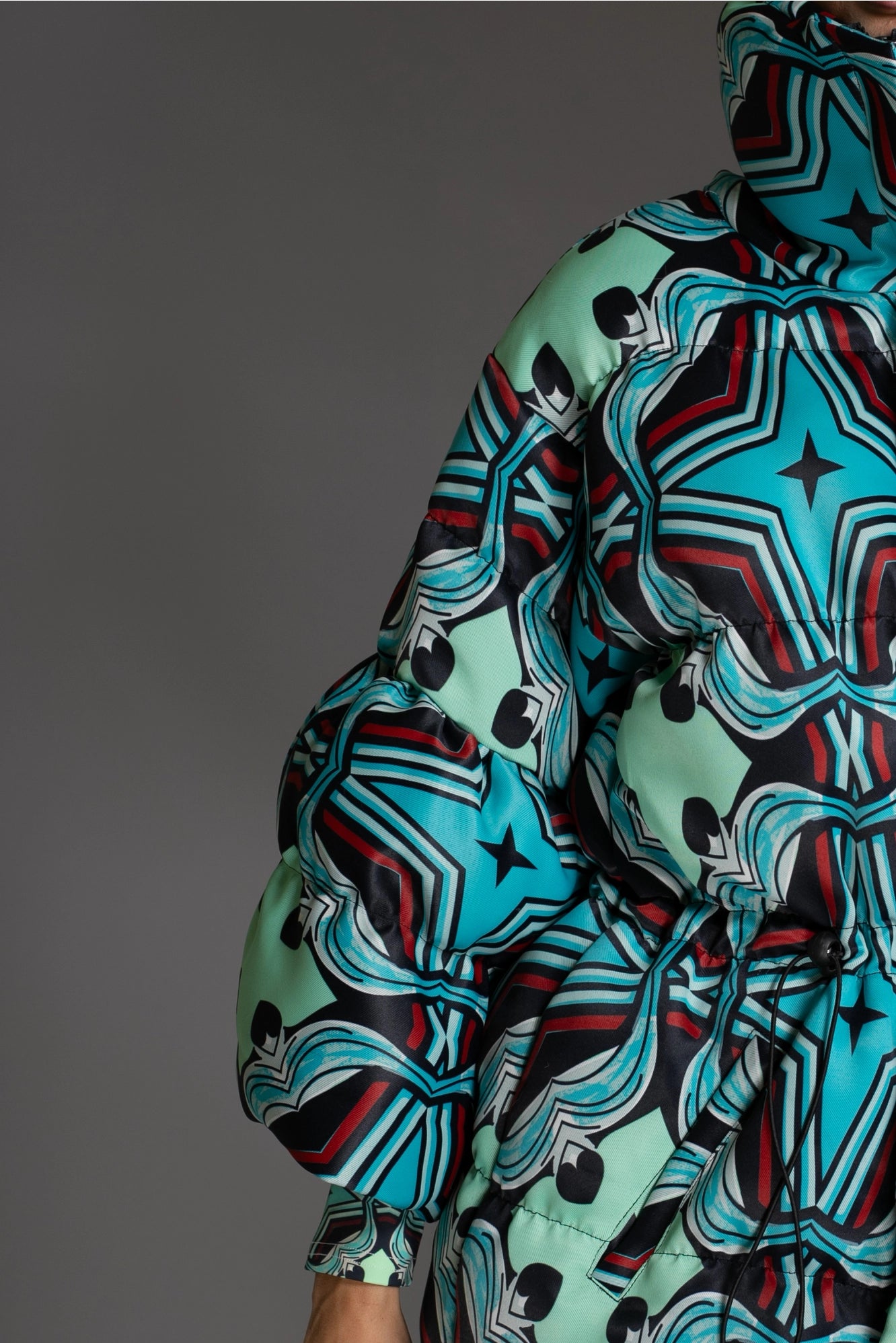 Introducing an outerwear essential that seamlessly merges artistic vision with practical warmth. This quilted puffer coat showcases an exclusive Stars print—a vibrant, intricate pattern that commands attention while maintaining refined sophistication. Engineered with exaggerated puff sleeves and precision quilting, the design delivers striking visual impact without compromising mobility or comfort. Constructed from premium materials in Los Angeles, the coat provides exceptional insulation for winter's harshest conditions while remaining surprisingly lightweight. The tailored silhouette, front zipper closure, and functional pockets ensure this statement piece transitions effortlessly from alpine adventures to urban exploration. A transformative layer that elevates any wardrobe with understated luxury and distinctive style.