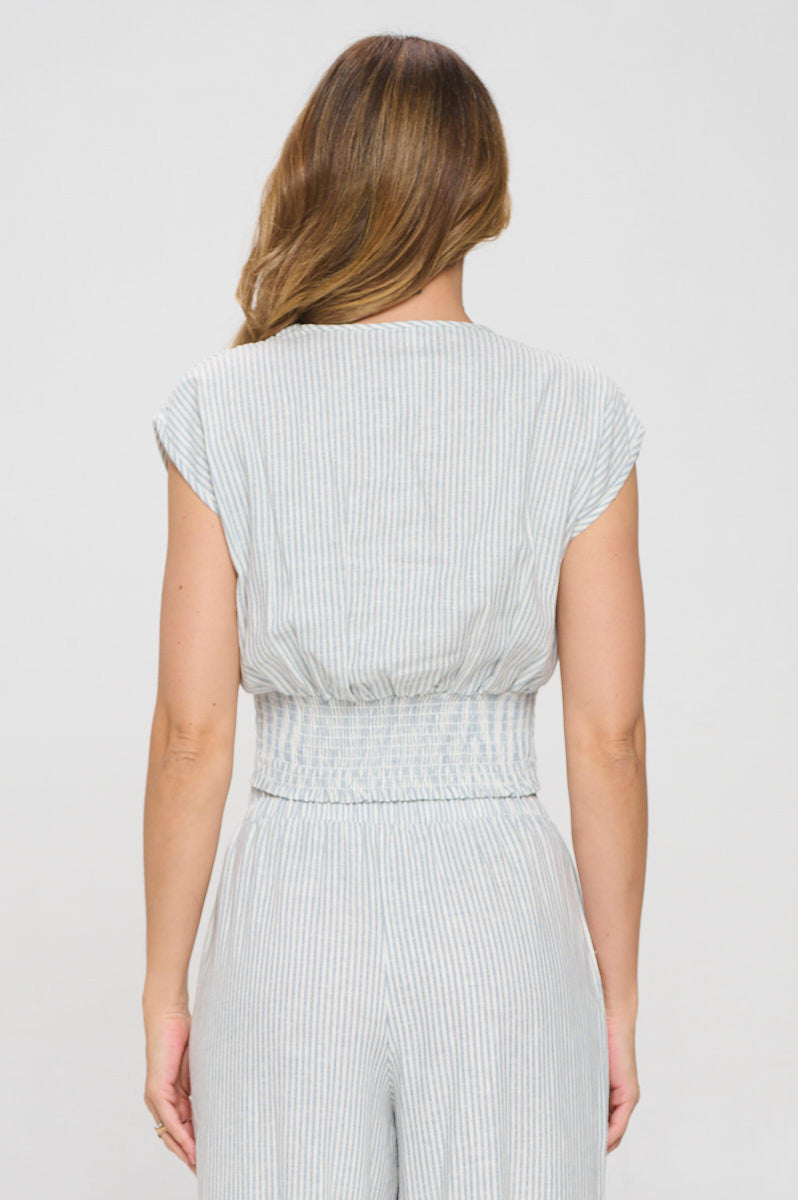 Made in USA Striped Print V neck Crop Top w Smock Back Detail. Fabric content: 55% Linen, 45% Viscose.