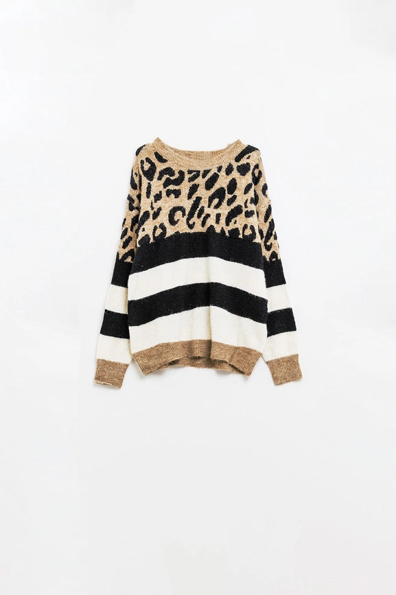 Stylish Knitted Panther Print Sweater with Black and White Stripes