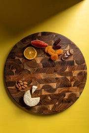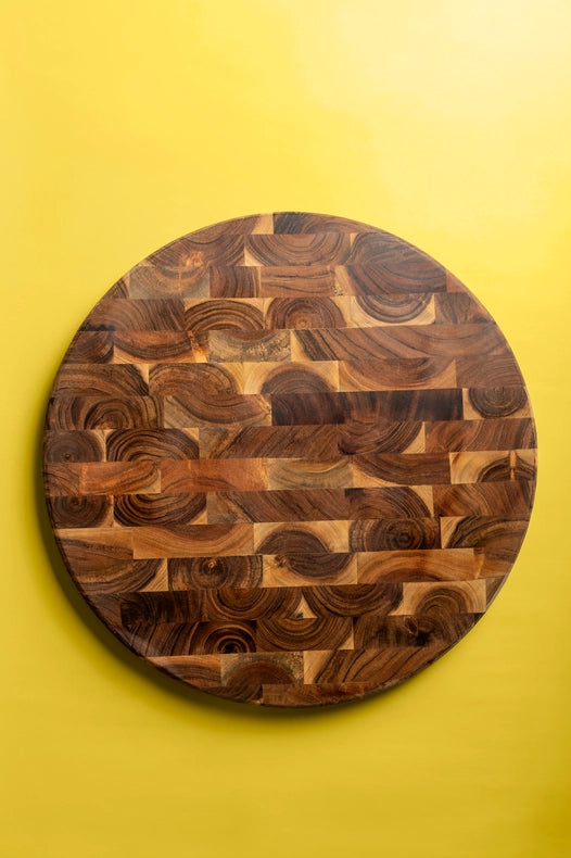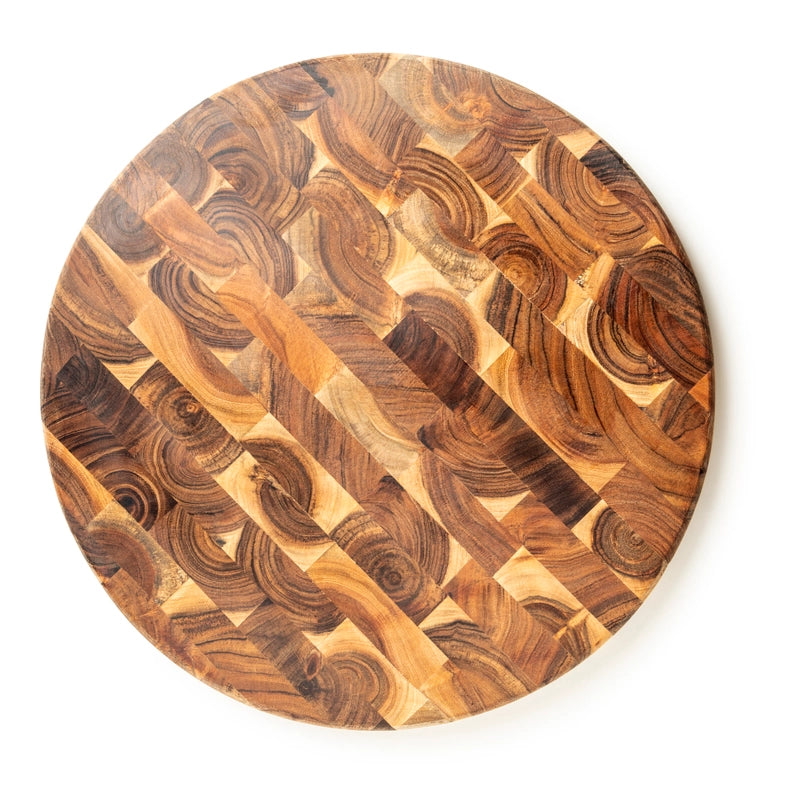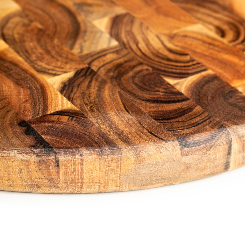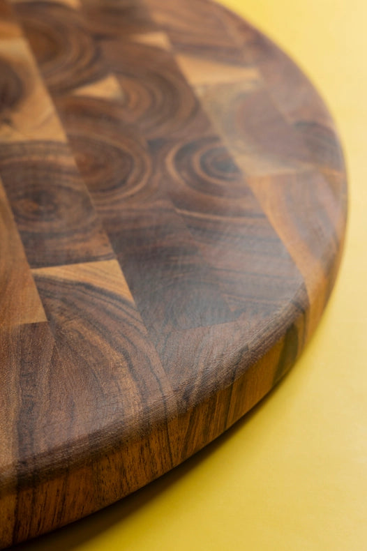 Expertly handcrafted from high quality and ethically sourced Acacia Wood, the Taiga Cutting Board is a statement piece for any kitchen. With its round shape measuring 16 inches in diameter and varying shades of brown, this board is not only functional but also a work of art. Package includes one board.