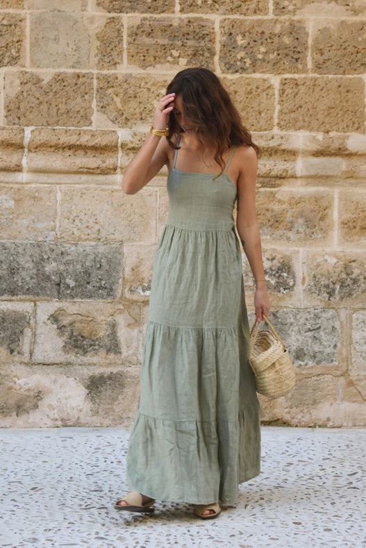 Introducing the Alma Dress in Sage - the perfect blend of casual and classy. Made from luxurious faded sage green linen, this dress features a square neckline, thin feminine straps, and a plunging low back. With a self-tie for the perfect fit, it's effortless, comfortable, and chic. Plus, for every dress sold, a tree is planted in the Amazon Rainforest. Made in Italy.