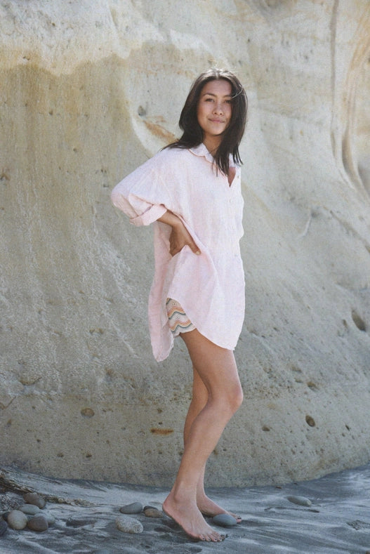 Introducing the Palma Shirt in Blush - the epitome of effortless style. Made from pure linen, it promises a breathable finish and oversized fit. With beautiful mother of pearl buttons, this classic shirt is a must-have for any wardrobe. Plus, for every shirt sold, we plant a tree in the Amazon Rainforest. Made with care in Italy.