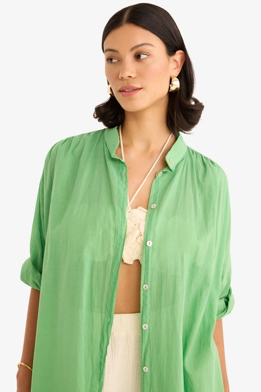 The Romi Dress is a versatile midi dress that effortlessly combines comfort and style. Made with 100% cotton, it features a relaxed, beach-inspired design and long sleeves with gathered cuffs for a subtle puff effect. Whether you're at the beach or out for a casual day, this soft green dress is the perfect choice.