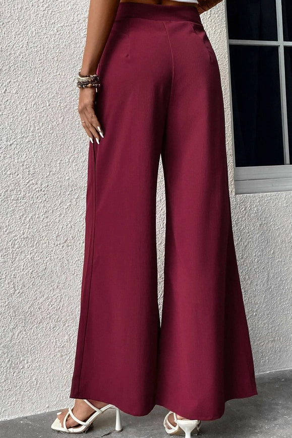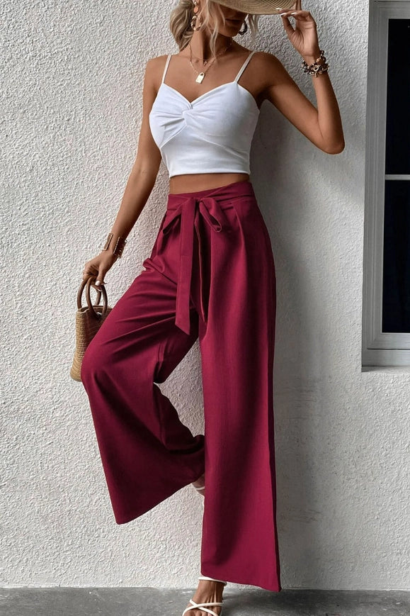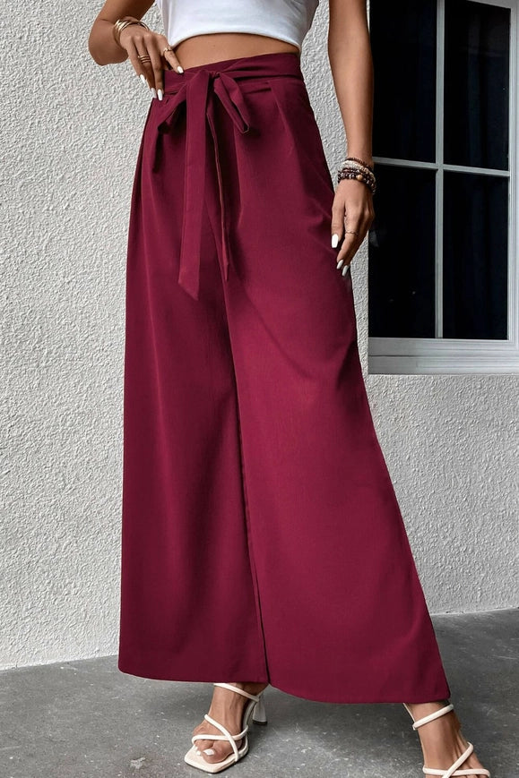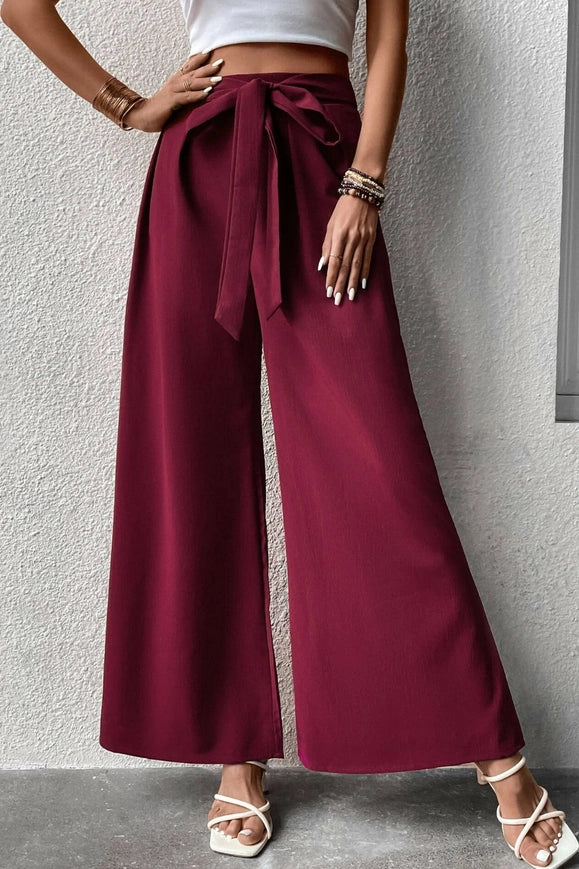Expertly crafted with a minimalist style, these Tie Front Wide Leg Pants provide a chic and sophisticated look. Made from 100% polyester, these long pants feature a tie detail and are not lined for a lightweight feel. Easy care instructions make them a convenient addition to any wardrobe.