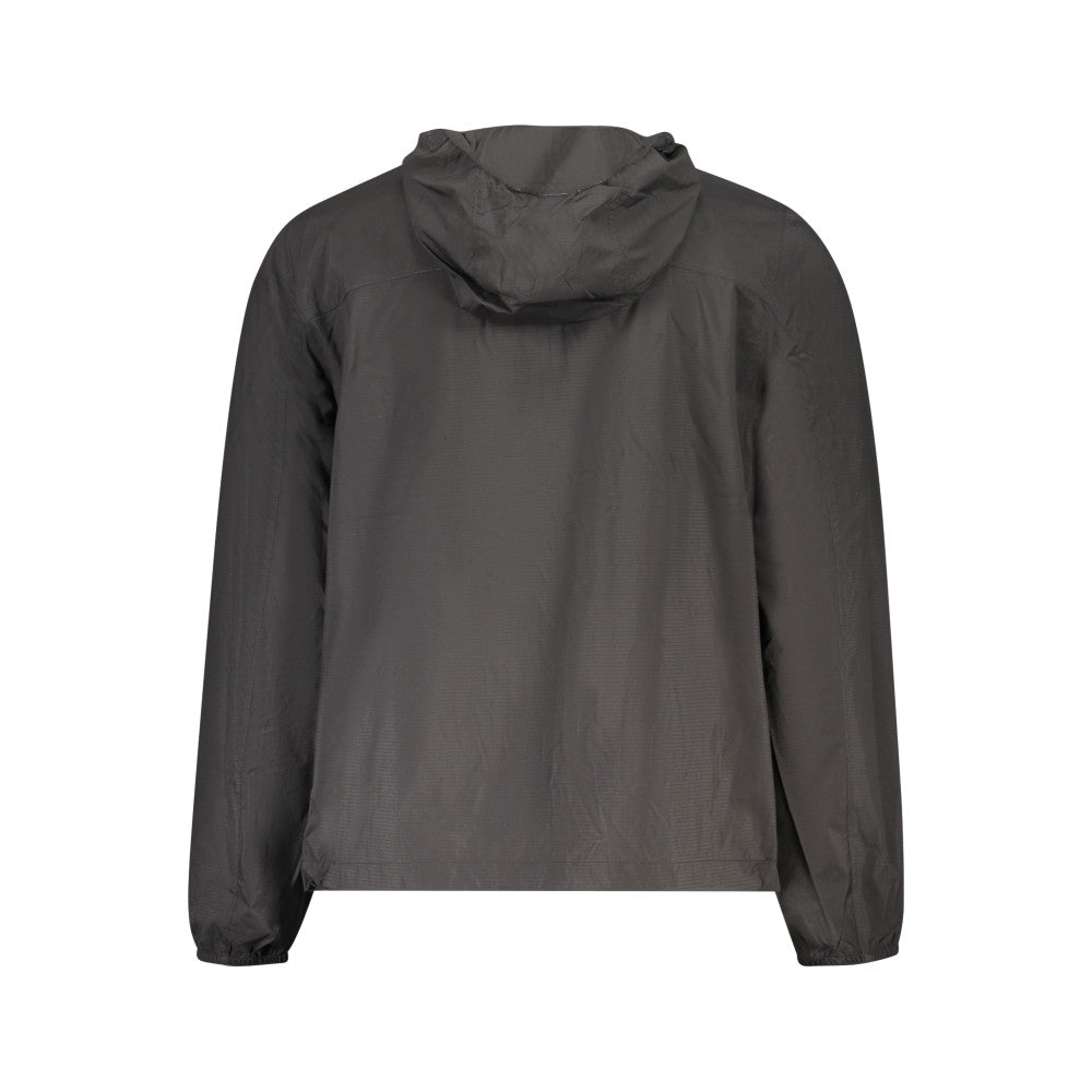 This long-sleeve jacket features a hood, two external pockets, and two internal pockets. It includes a zip closure, distinctive print, and logo branding. Made with 95% recycled nylon, it is crafted from 100% polyamide for durability and sustainability.