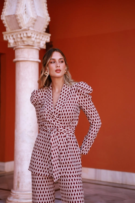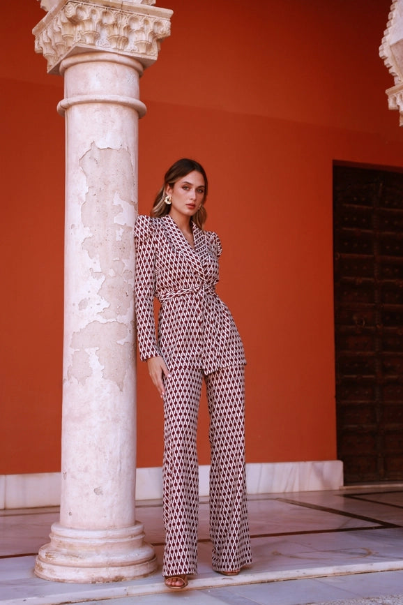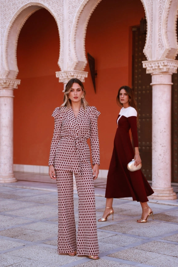 Indulge in elegance with the Traje Gloria burgundy and white printed crepe suit. The puffed sleeves and ribbon closure add a touch of sophistication to this stunning ensemble. Its long, slightly flared trousers feature a waistband and invisible zipper, providing excellent fit and comfort. Made in Spain, this suit is the perfect choice for any cocktail event, wedding, or formal occasion. Embrace the Fall/Winter 2024 collection and make a statement with this printed suit.