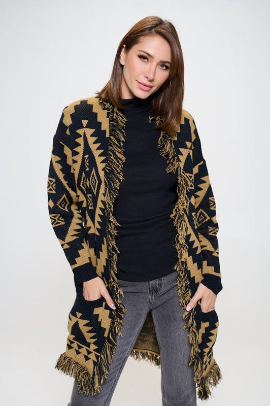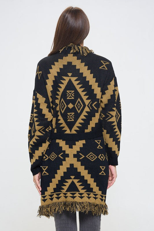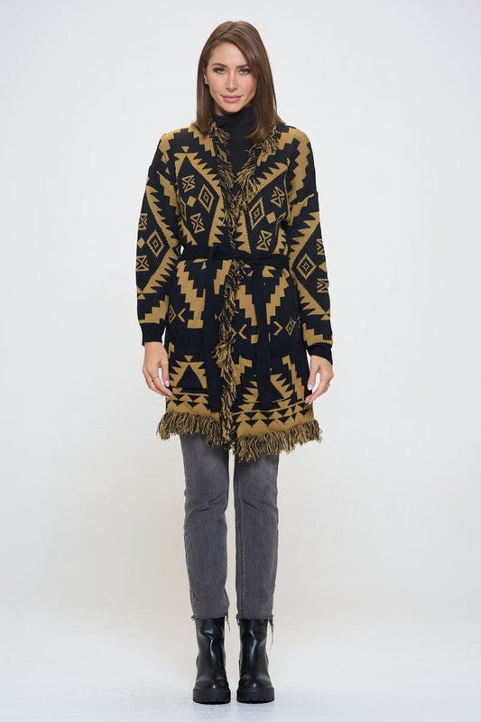 Tribal Print Cardigan with Fringe Detail and Tie-Cardigans-Reneecollection-Small-TAUPE/BLACK-Urbanheer