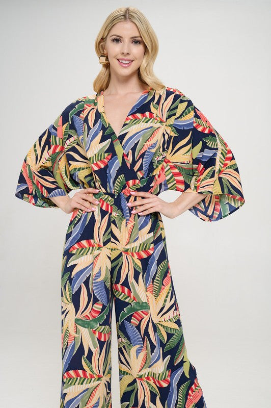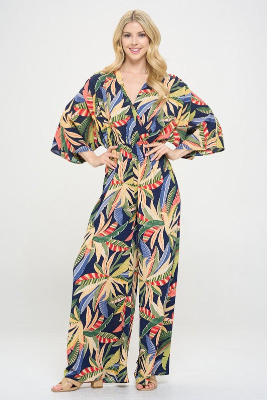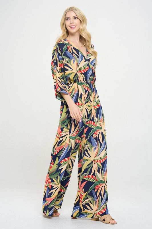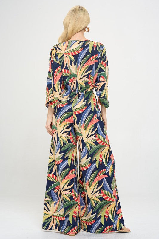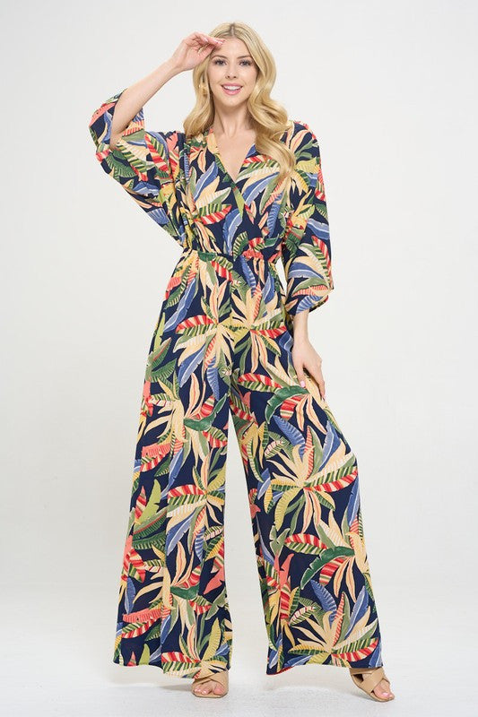 Tropical Print V neck 3/4 Sleeve Wide Leg Jumpsuit