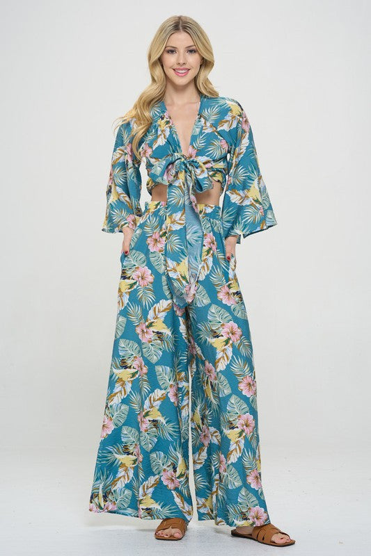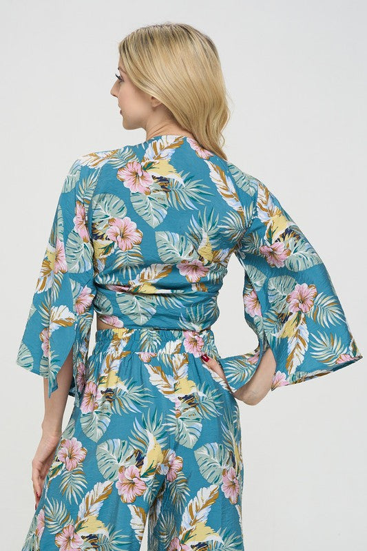 Tropical Print V neck 3/4 Sleeve Wrap Top w Tie