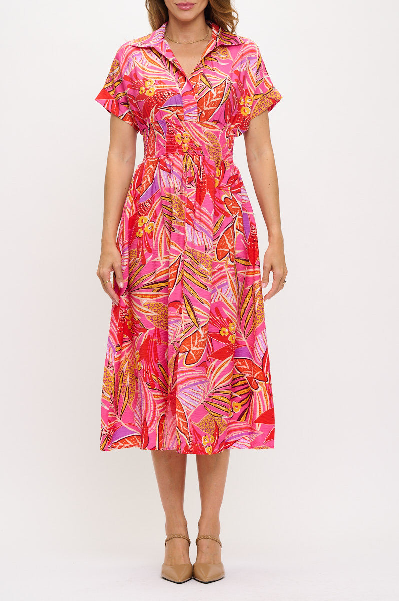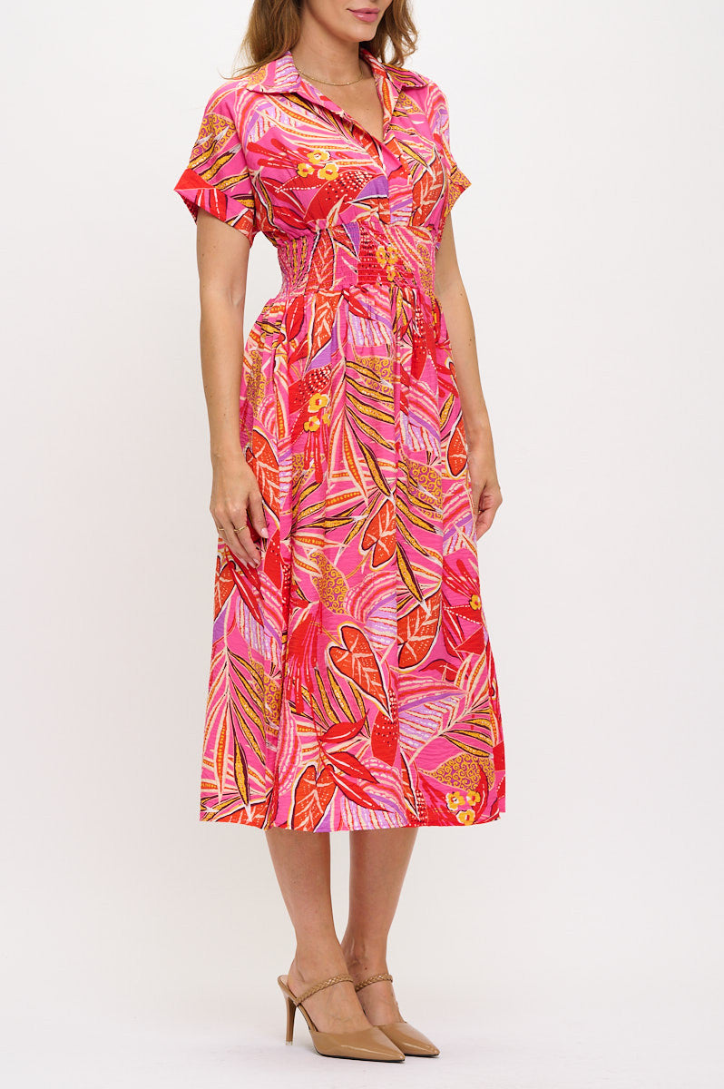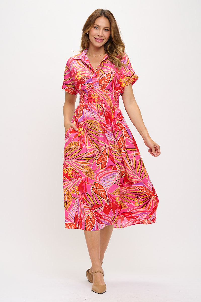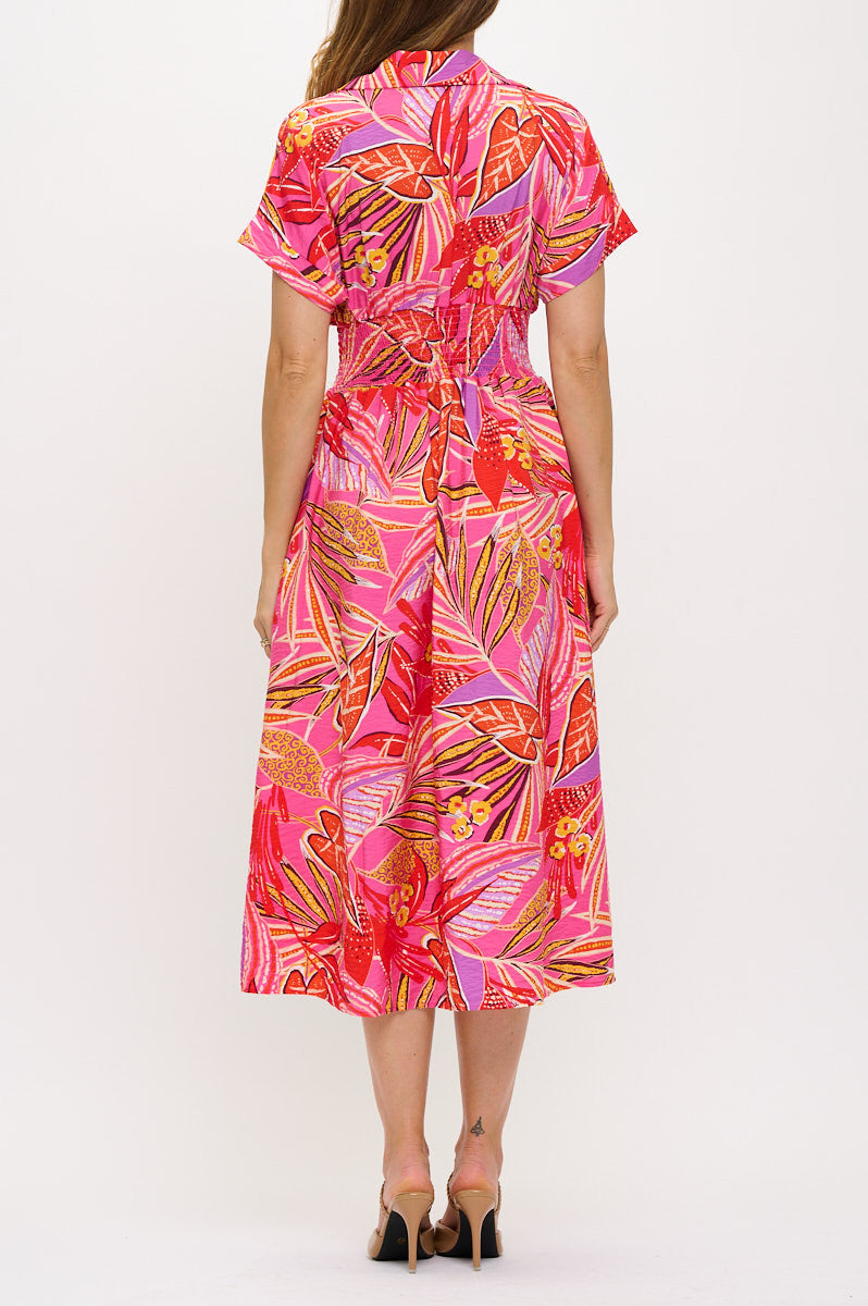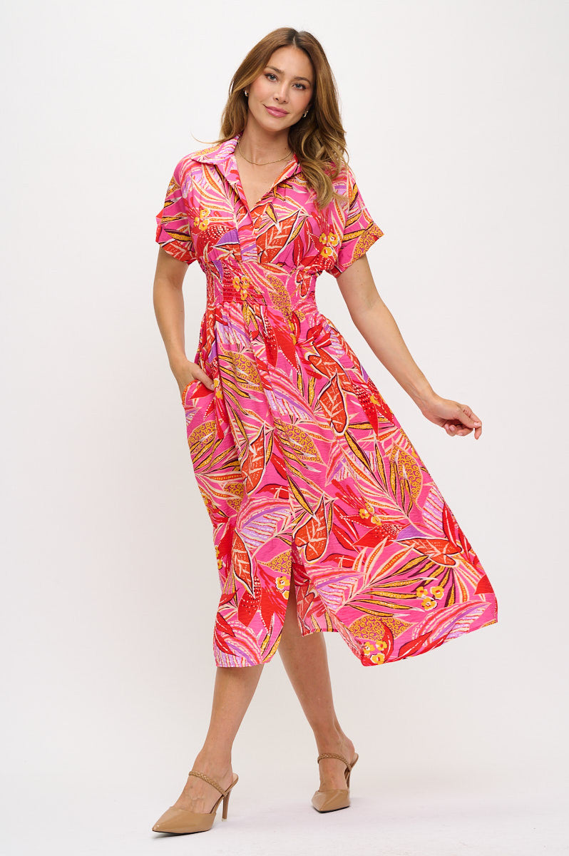 Made in USA Tropical Print V neck Collared Dress with Smock Waist Detail. Available in other Colors.