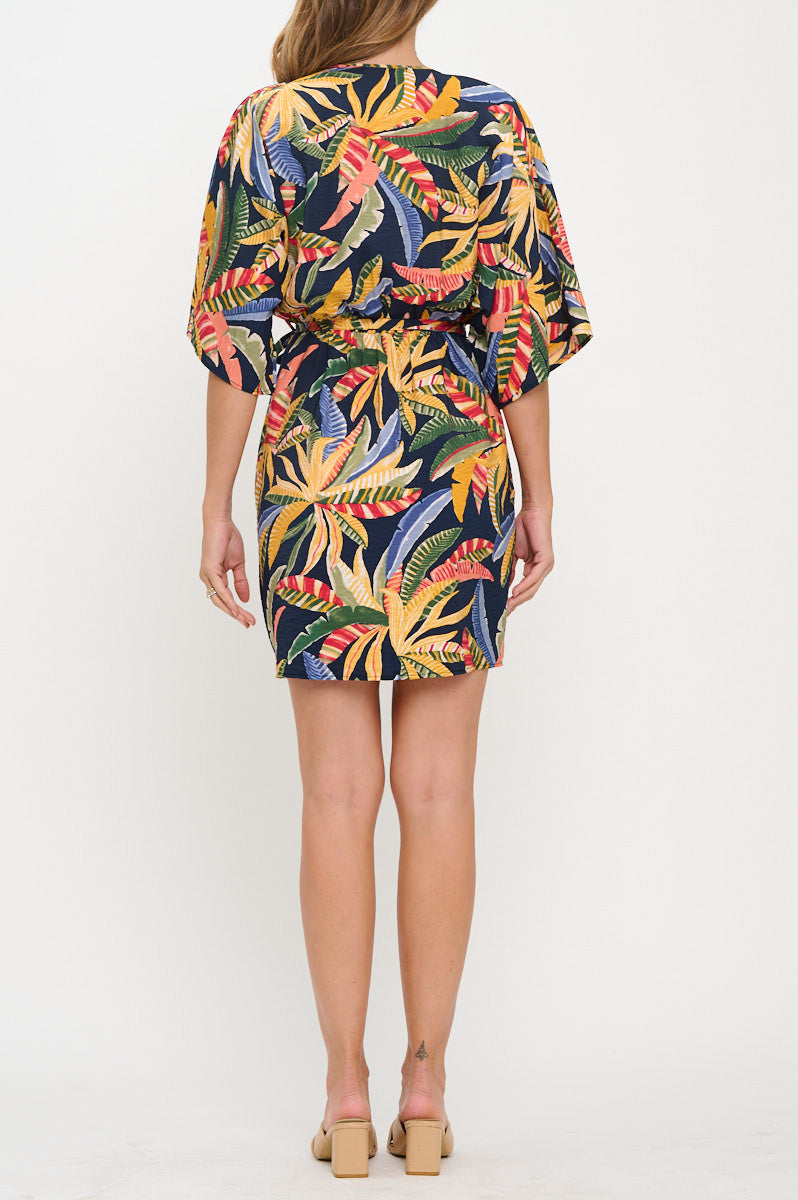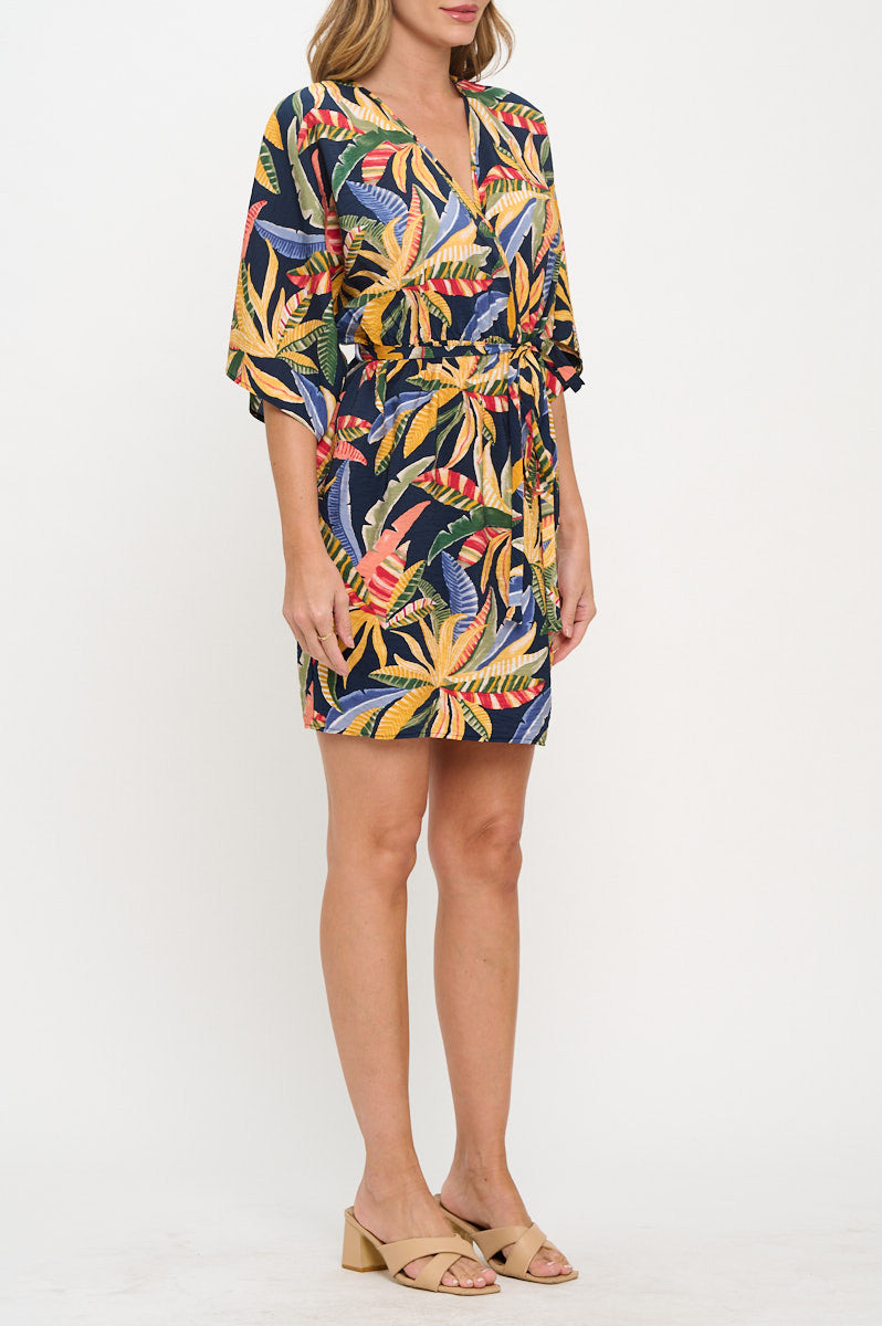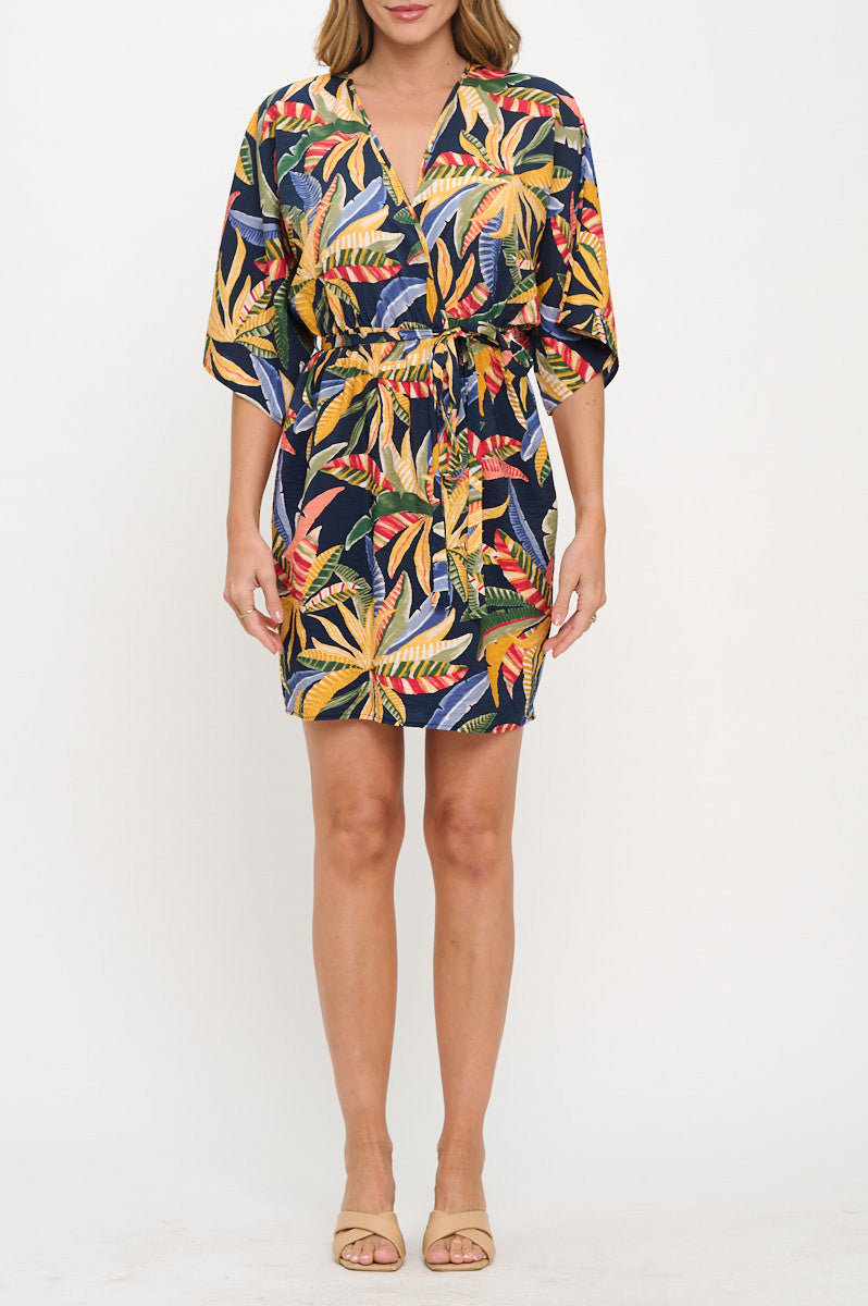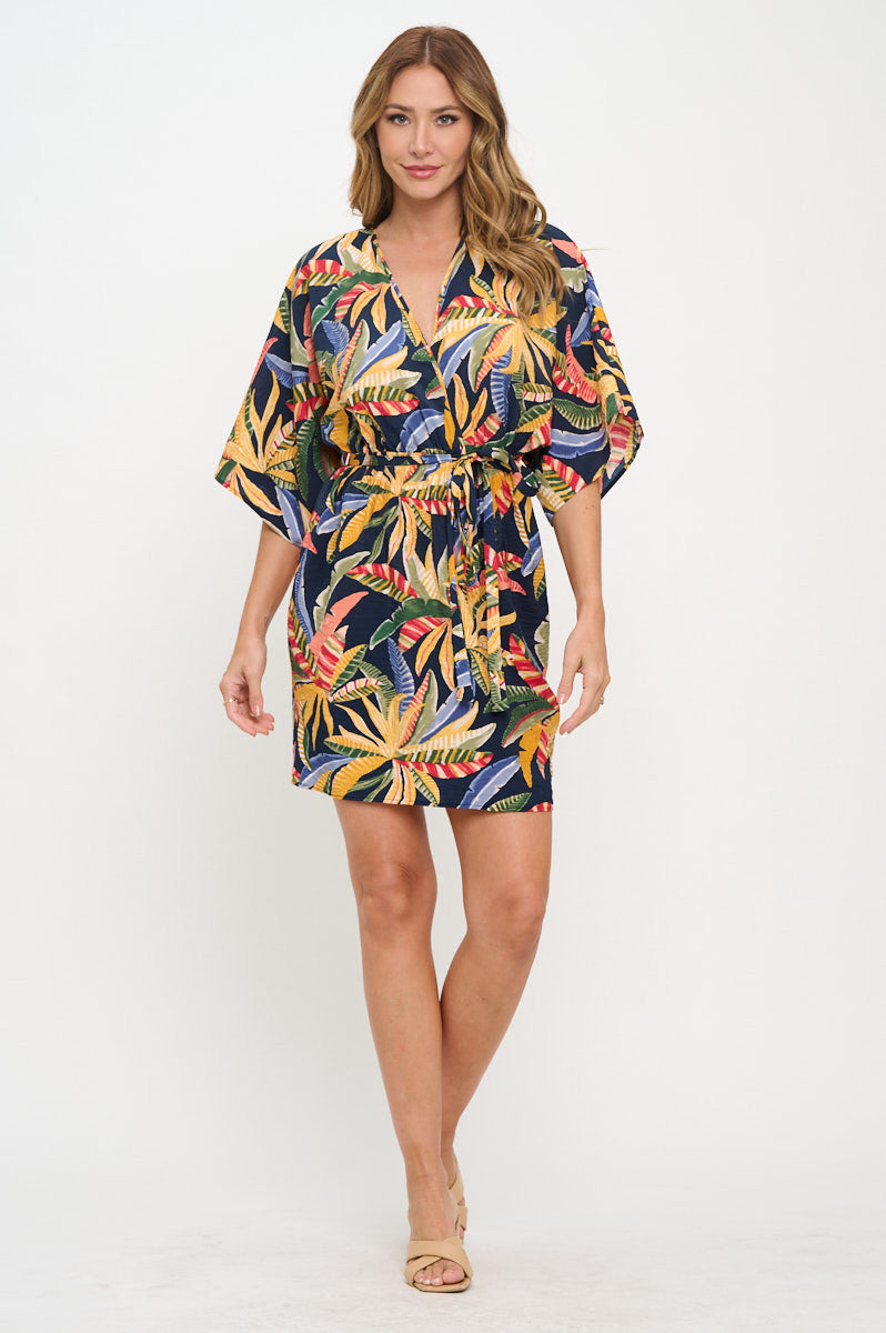 Tropical Print V neck Kimono Dress with Tie-Dresses-Reneecollection-Small-NAVY-Urbanheer