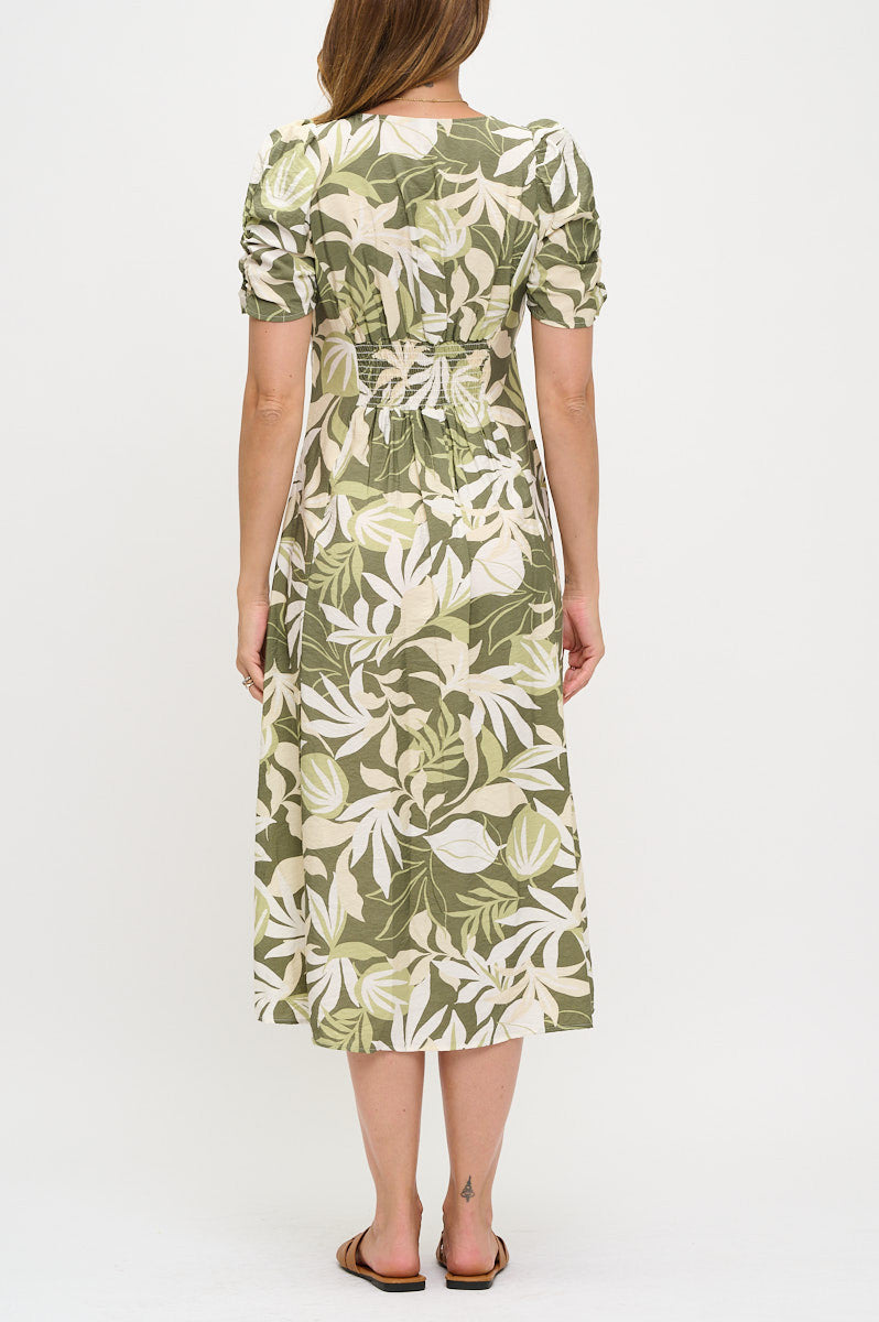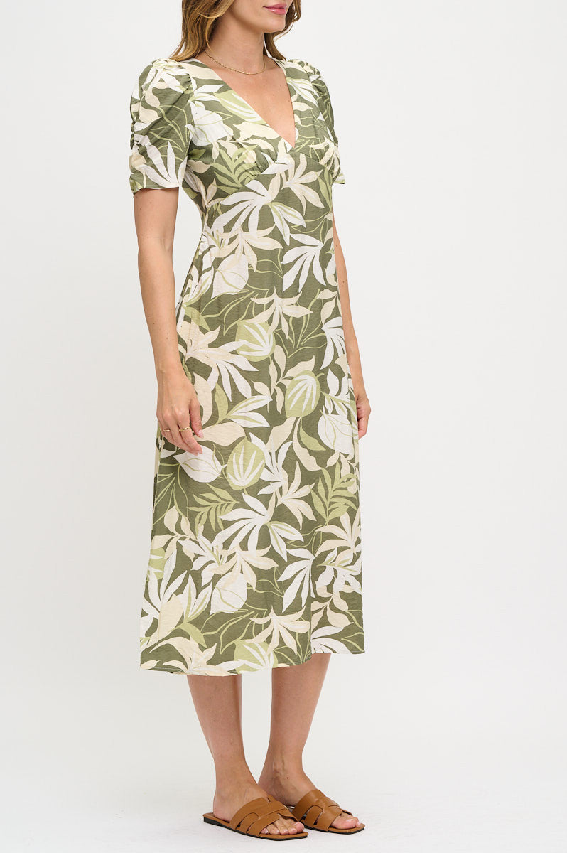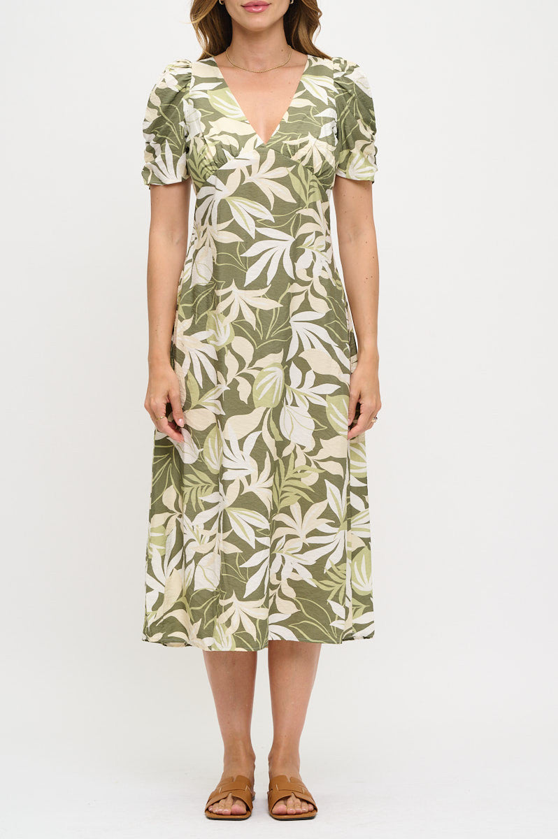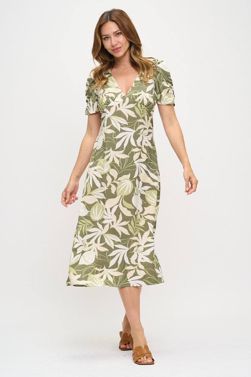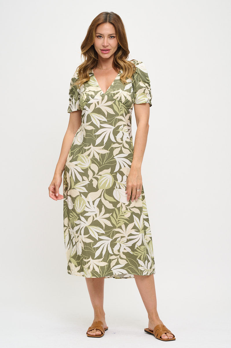 Made in USA Tropical Print V neck Midi Dress with Scrunch Sleeve. Available in other Colors.