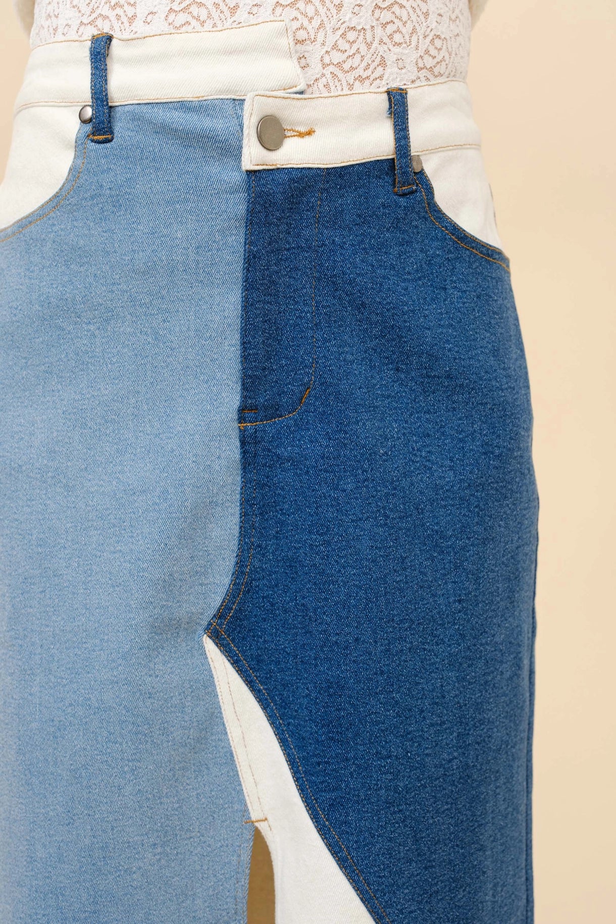 This maxi skirt showcases an artfully assembled patchwork design, blending rich indigo and pale blue denim panels into a distinctive silhouette. Crafted from premium cotton denim, each segment is thoughtfully positioned to deliver visual intrigue and contemporary style. The irregular composition elevates the piece beyond conventional denim wear, making it an ideal choice for those seeking refined, fashion-forward pieces with character and depth.