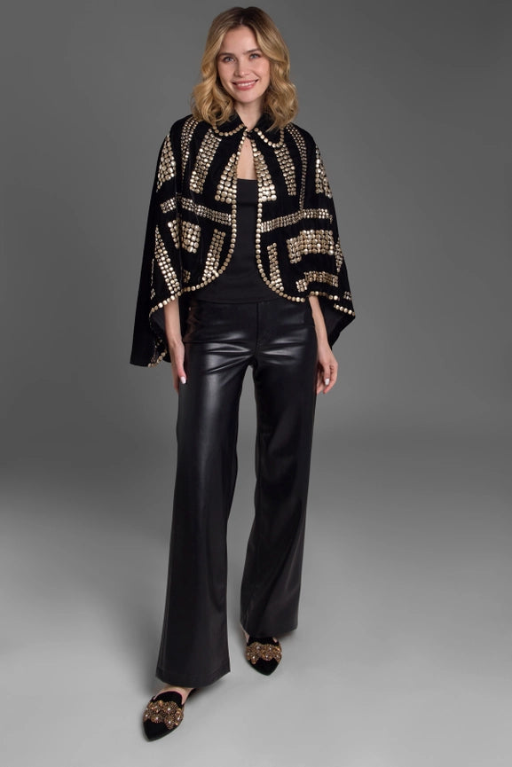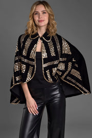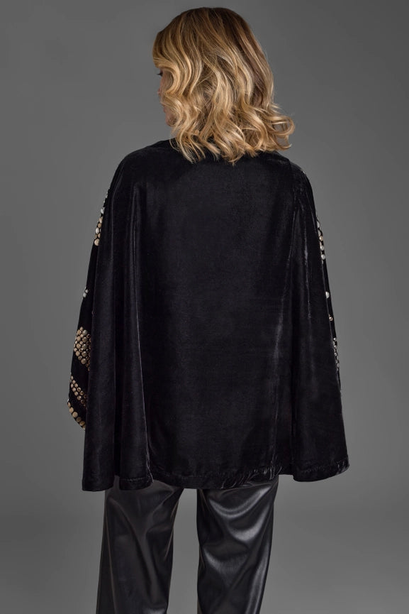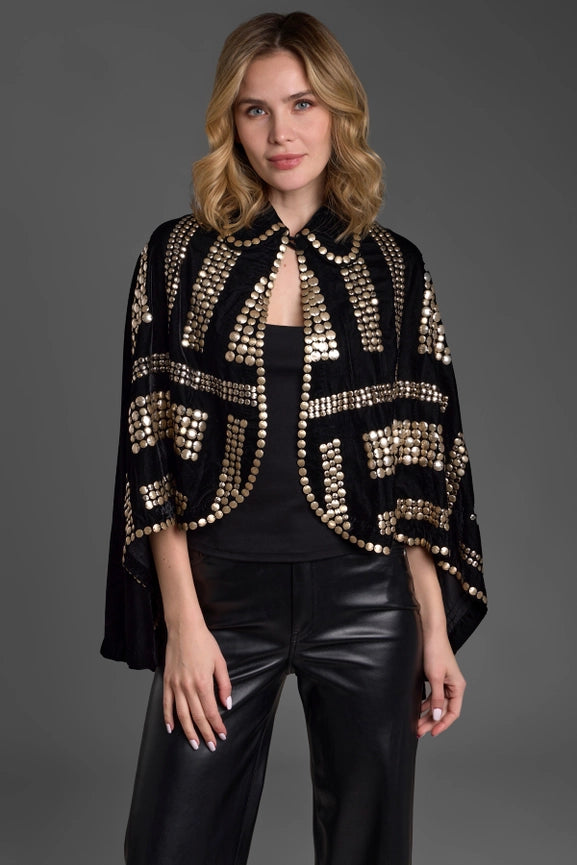 Elevate your style with our Black Velvet Sequin Party Capelet. The luxurious black velvet base is adorned with shimmering holographic sequins in a chunky striped pattern. Its versatile button and tie closure allows for various styling options, making it perfect for dressing up any outfit. Crafted with 100% polyester, this capelet was made in India for a touch of global style.