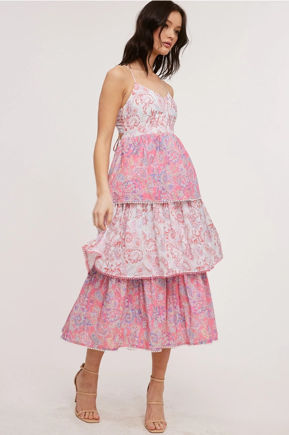 Step into summer with the Vintage Paisley Tiered Maxi Dress. The delicate pink and white paisley print blooms beautifully, while the airy silhouette and playful pom-pom trim add a touch of whimsy. Perfect for warmer days, this dress will surely turn heads.