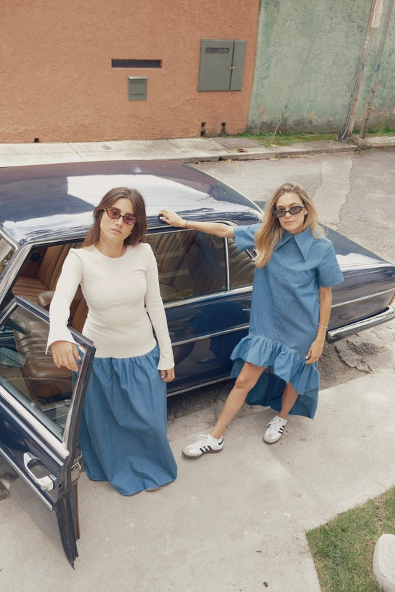 Elevate your wardrobe with our Violette Denim Dress. Crafted from high-quality denim, this dress features an exaggerated pointed collar, cap sleeves, and a stunning ruffled hem. Its versatile design makes it perfect for any day event, from brunch to baby showers, or dress it up for a stylish wedding guest look. Made in the United States for a touch of quality you can feel.