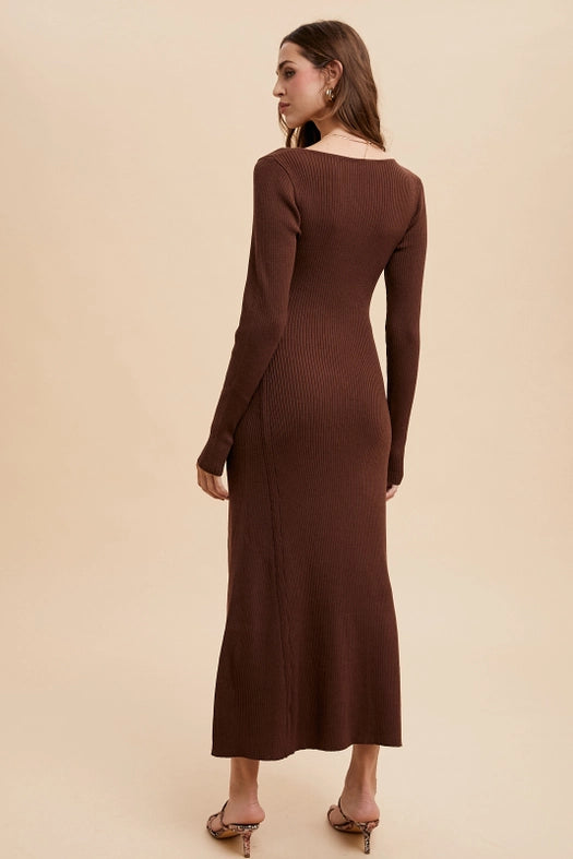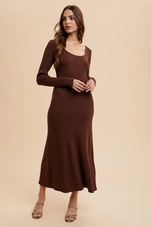 Expertly crafted with a viscose blend for a luxurious touch, this sweater knit maxi dress features a flattering square neckline and form-fitted silhouette. Versatile and comfortable, it's perfect for layering and adding a touch of sophistication to any outfit.