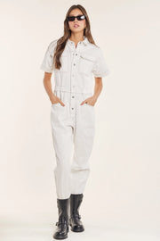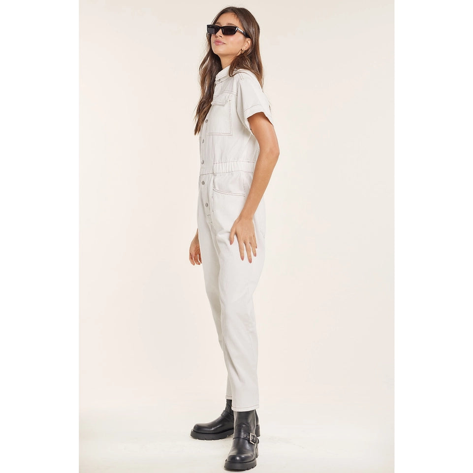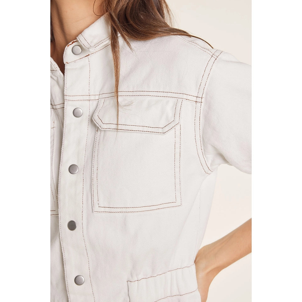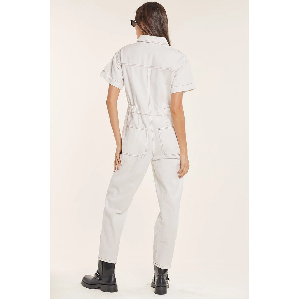 Washed Denim Jumpsuit with Contrast Stitch Details OFF WHITE