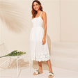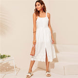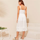 White Embroidered Eyelet Hem Button Up Summer Boho Dress Women Straps Empire Dress Solid Fit and Flare Long Cami Dresses