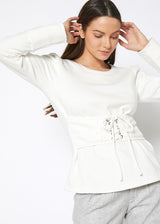 Women's crewneck long sleeve sweatshirt with corset tie front.