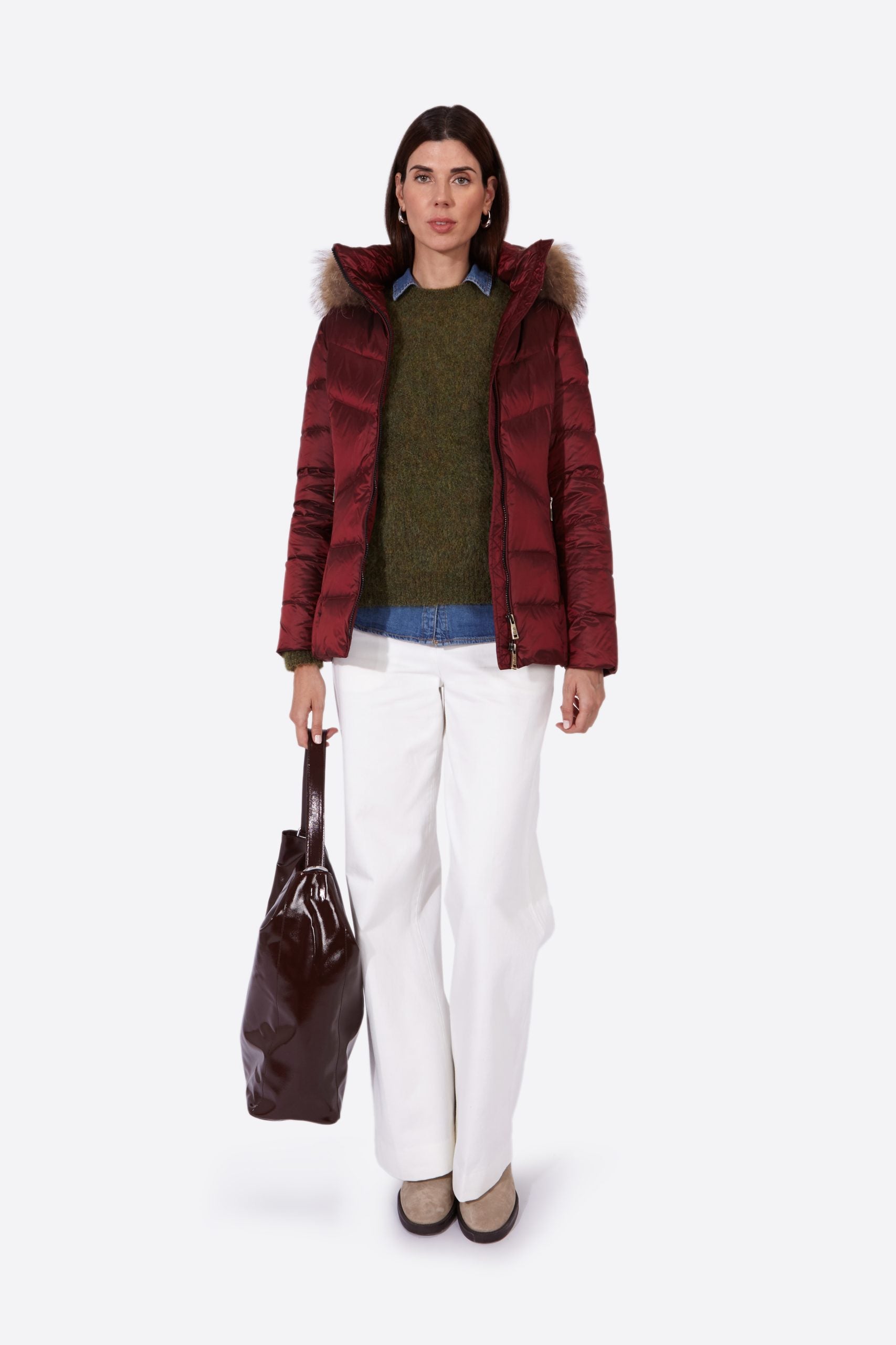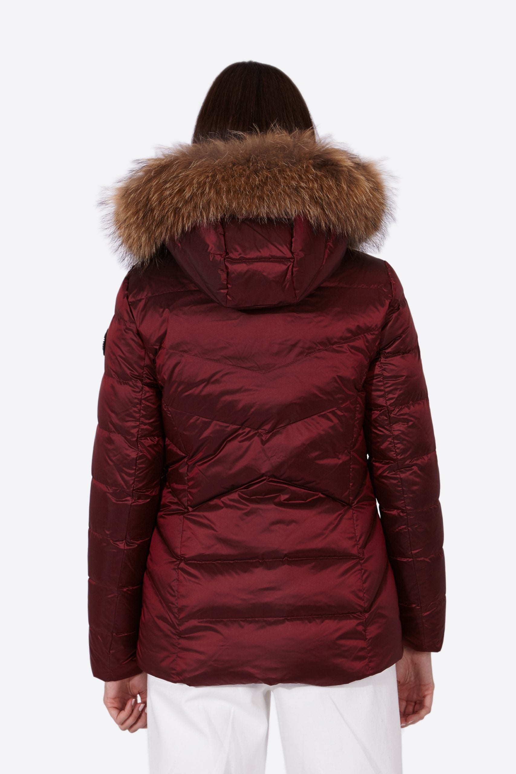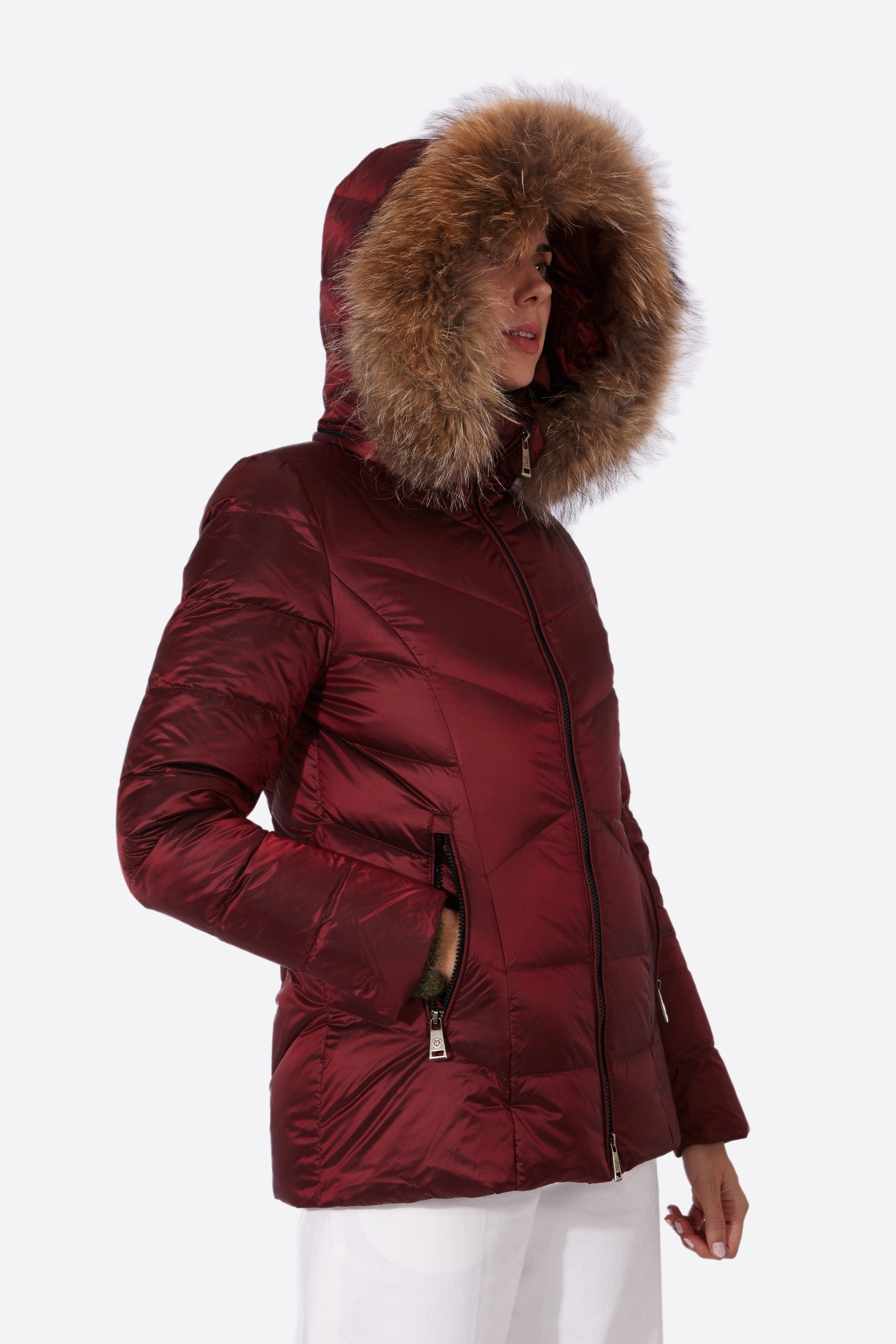 Stay warm and stylish with the Women's down jacket LENA-N. Featuring a detachable hood with natural racoon fur, this slim jacket is water repellent and windproof, perfect for chilly days. With a central double slider zipper closure and satin fabric finish, it also includes a zippered pocket and drawstring piping. Filled with 90% down and 10% feather, it's a cozy 70 cm long.
