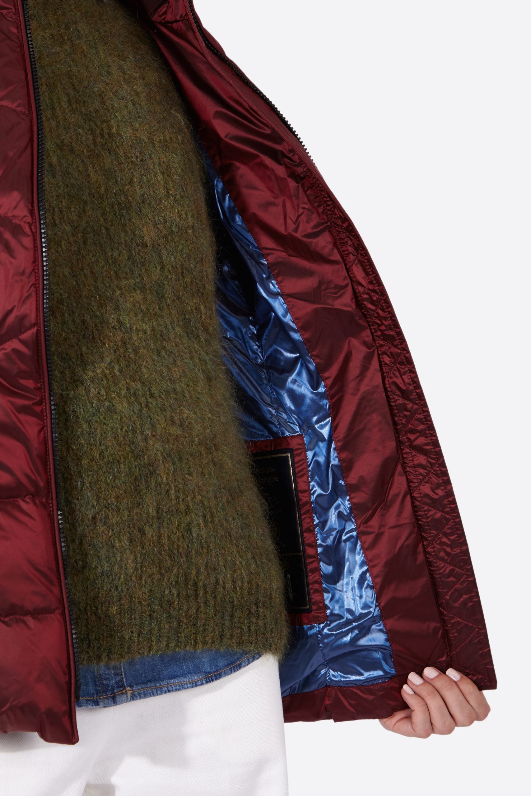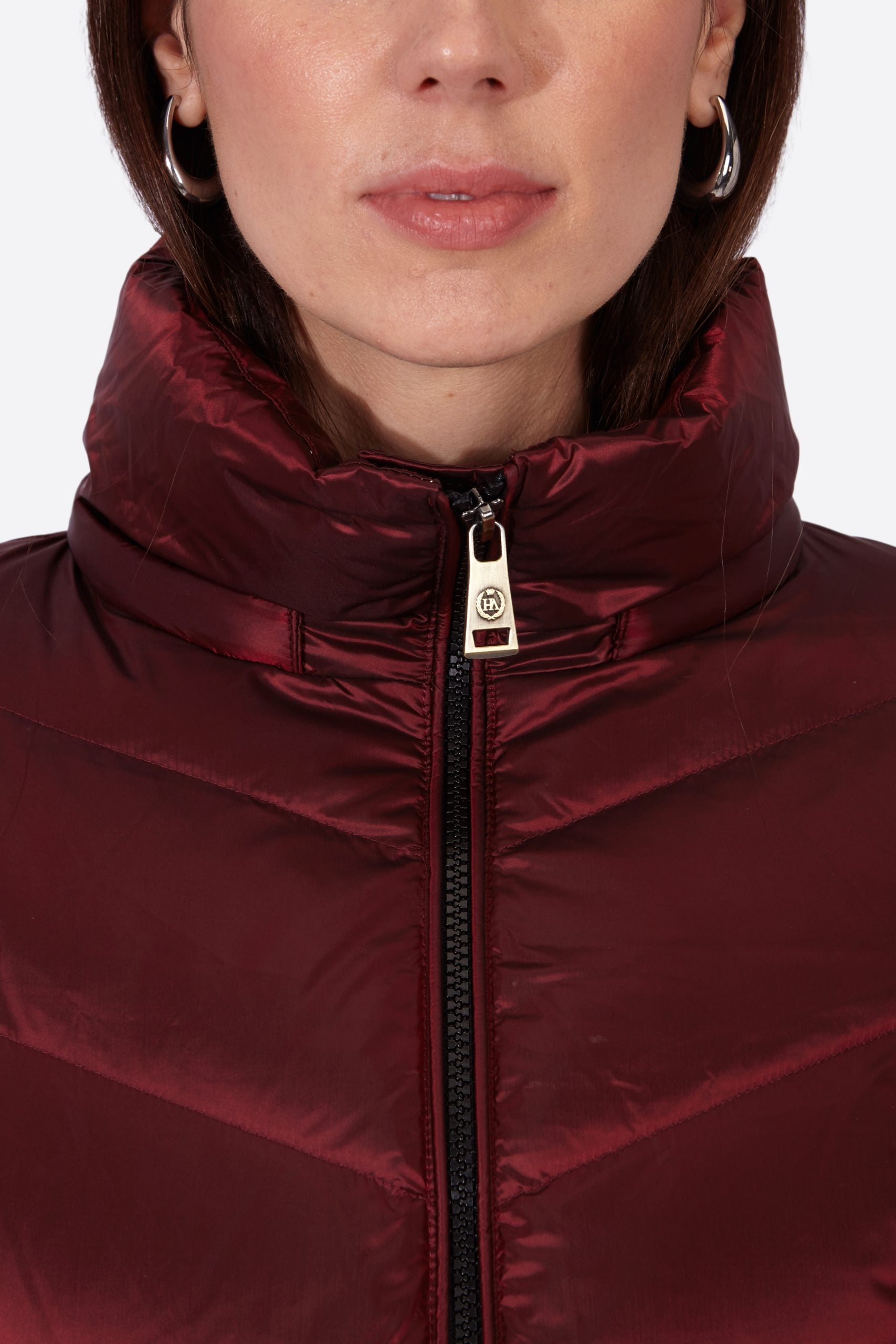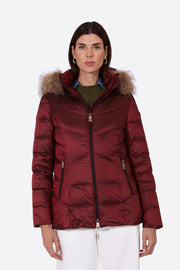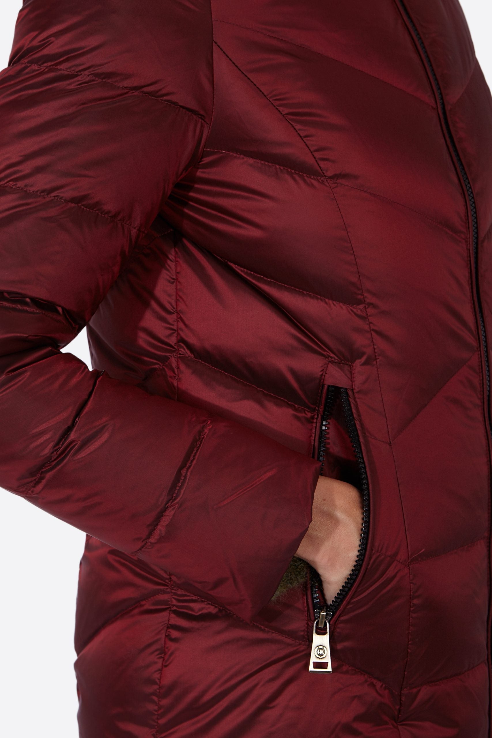 Stay warm and stylish with the Women's down jacket LENA-N. Featuring a detachable hood with natural racoon fur, this slim jacket is water repellent and windproof, perfect for chilly days. With a central double slider zipper closure and satin fabric finish, it also includes a zippered pocket and drawstring piping. Filled with 90% down and 10% feather, it's a cozy 70 cm long.