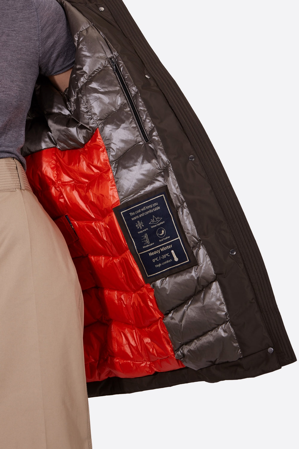 The Women's parka SNOWFALL offers a flattering slim fit and is made with water repellent fabric and an inner windproof membrane for maximum protection. A detachable hood with racoon fur provides added warmth and style. The central closure features a double zipper and inner sock, while zippered pockets and piping add functional details. Filled with 90% down and 10% feather, this parka guarantees warmth and comfort.