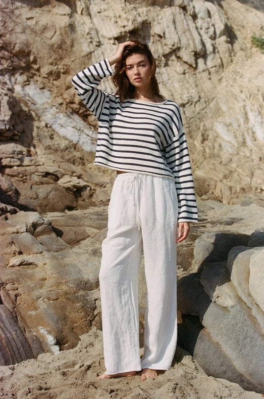 The Novah Pants are expertly crafted from 100% linen, known for its breathability and durability. The elastic waistband and tie strap provide a comfortable and adjustable fit. These wide leg pants are perfect for any occasion, offering a timeless and elegant look.