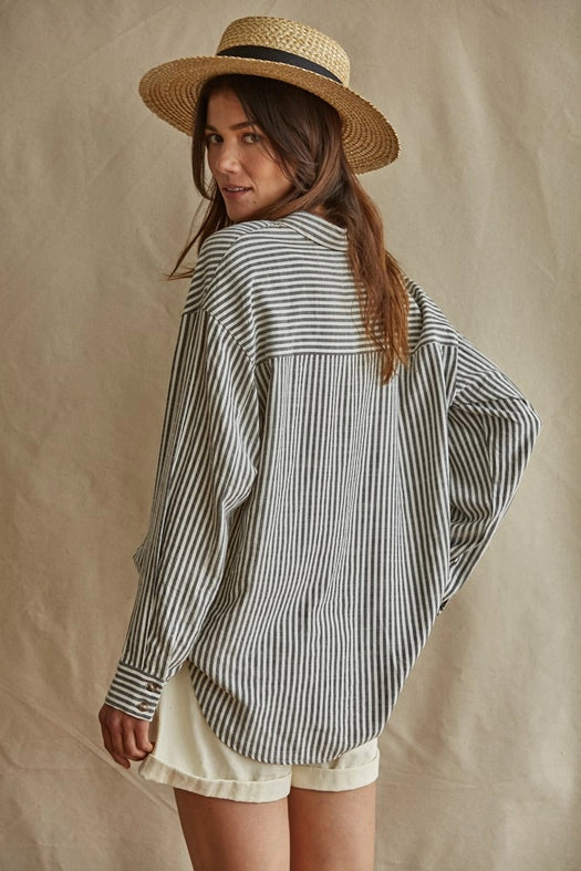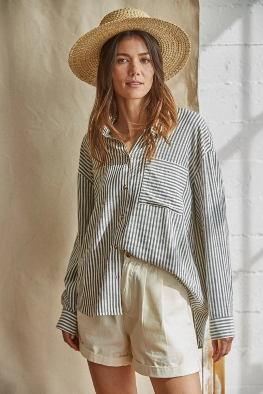 The Vincent Button Down is a versatile wardrobe essential with a timeless striped pattern. Made from a soft cotton-polyester blend, it offers a comfortable, relaxed fit. Featuring a classic collar, convenient chest pocket, and rolled cuffs, it's perfect for any occasion.