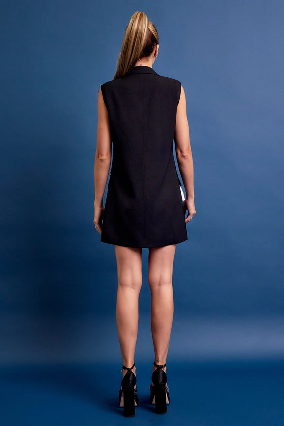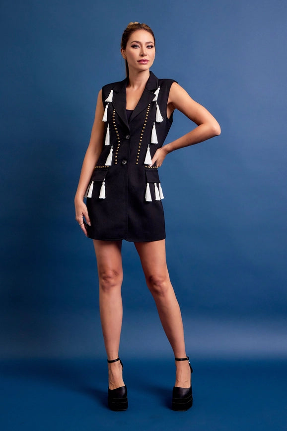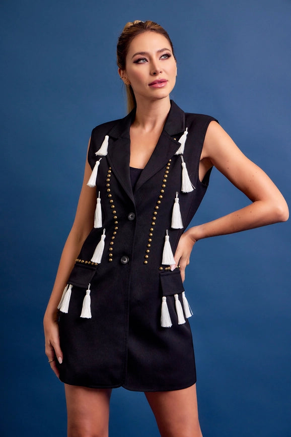 Woven Studded Sleeveless Blazer Dress Tassels BLACK