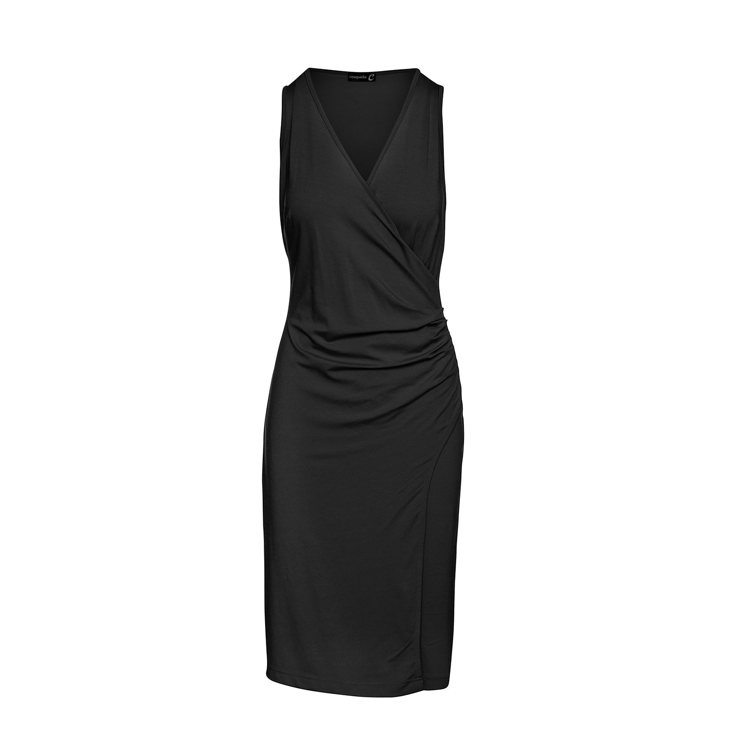 Solid colour sleeveless dress in stretch jersey fabric: viscose-elastane. Wrap style in the front culminating in pleats at the waist on the left front side. Solid colour stretch lining at the back. Measurements for size 38/M (in cm):Shoulder width-29, Bust-38, Waist-32, Hemline-42, Body length-102. 92%viscose-8%elastan